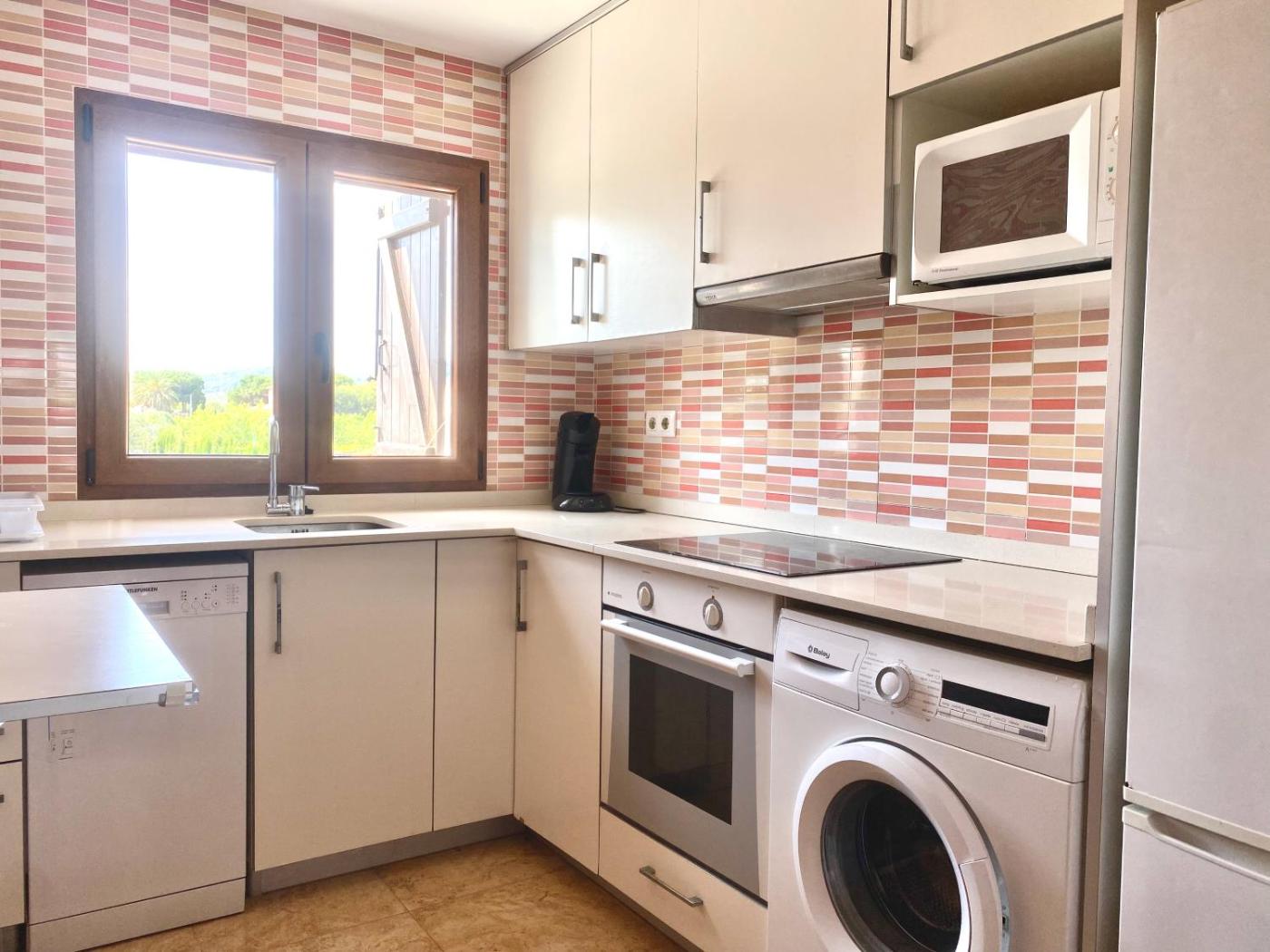 Two-Bedroom Apartment. This spacious apartment is comprised of 1 living room, 2 separate bedrooms and 1 bathroom with a walk-in shower and free toiletries. Meals can be prepared in the kitchen, which is fitted with a stovetop, a refrigerator, a dishwasher and kitchenware. Featuring a terrace with garden views, this apartment also offers a washing machine and a flat-screen TV. The unit offers 4 beds.